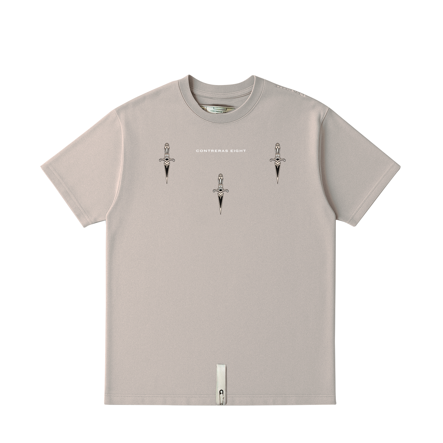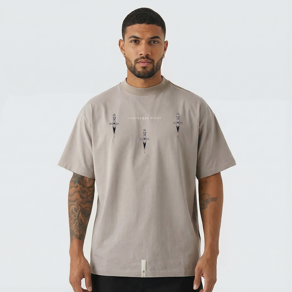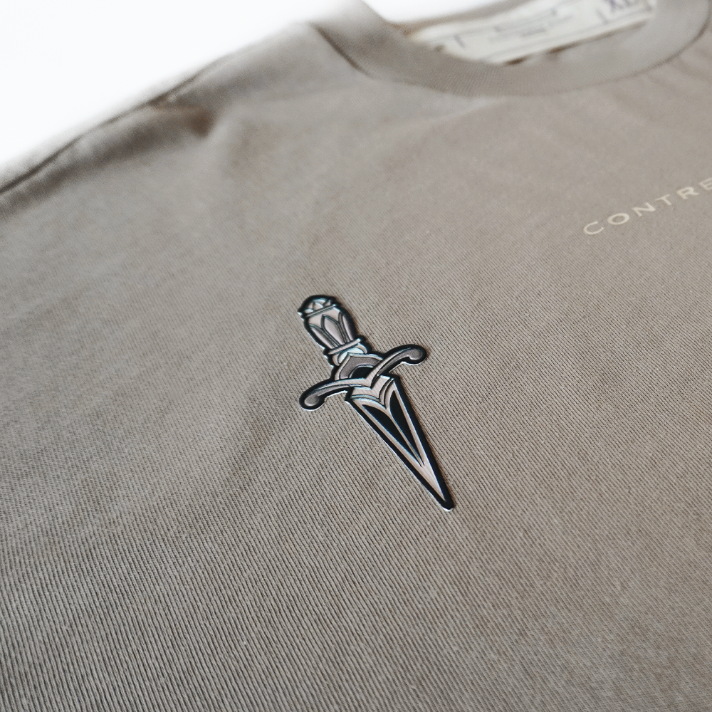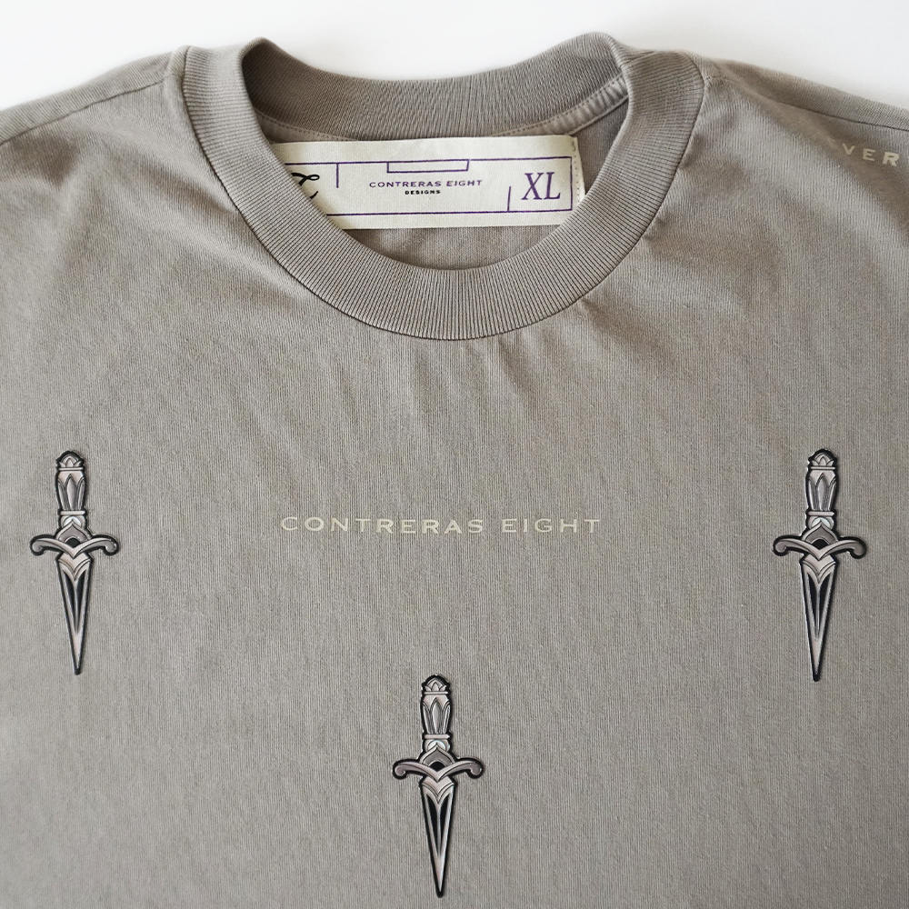 Tres dagas, una intención: precisión. Esta camiseta con apliques en alto relieve combina la estética callejera con una simbología de poder y defensa.Diseñada para quienes no temen destacar con sutileza, cada trazo refleja fuerza contenida y elegancia brutal.